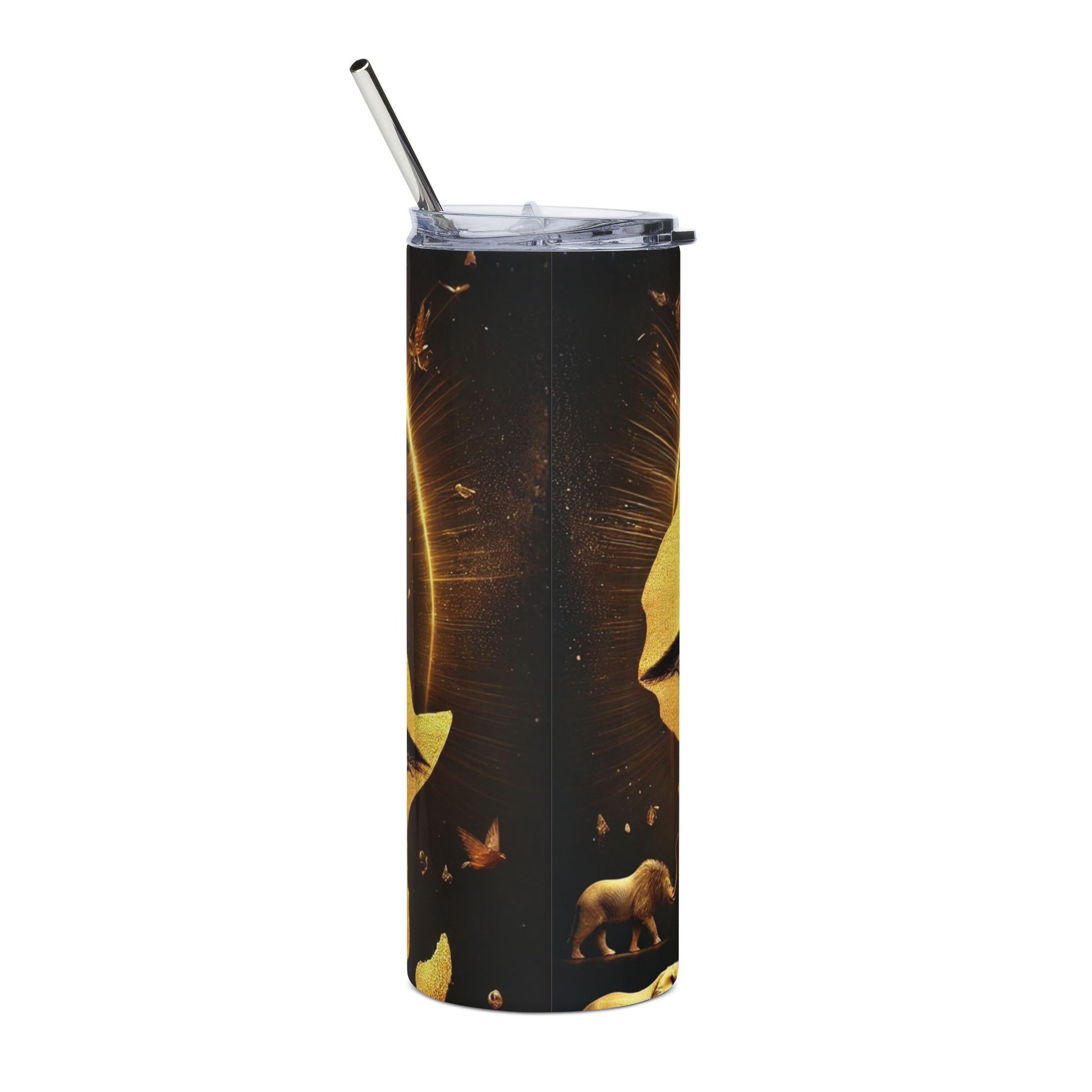 This 20 oz stainless steel tumbler is a living piece of art — a slender, cylindrical keeper that holds your drink and a story. The wraparound print features a regal, ebony-skinned figure crowned in golden ornaments, set against warm sunset tones and silhouettes of the savanna. Hold it and feel the quiet strength of dusk, the hush of wide-open plains, and a connection to heritage and ceremony. The glossy protective layer deepens the metallic highlights and preserves the rich, moody palette so the imagery stays vibrant through daily use. It fits into a commuter tote, a studio desk, or a hands-on creative day, bringing beauty and presence wherever you sip.