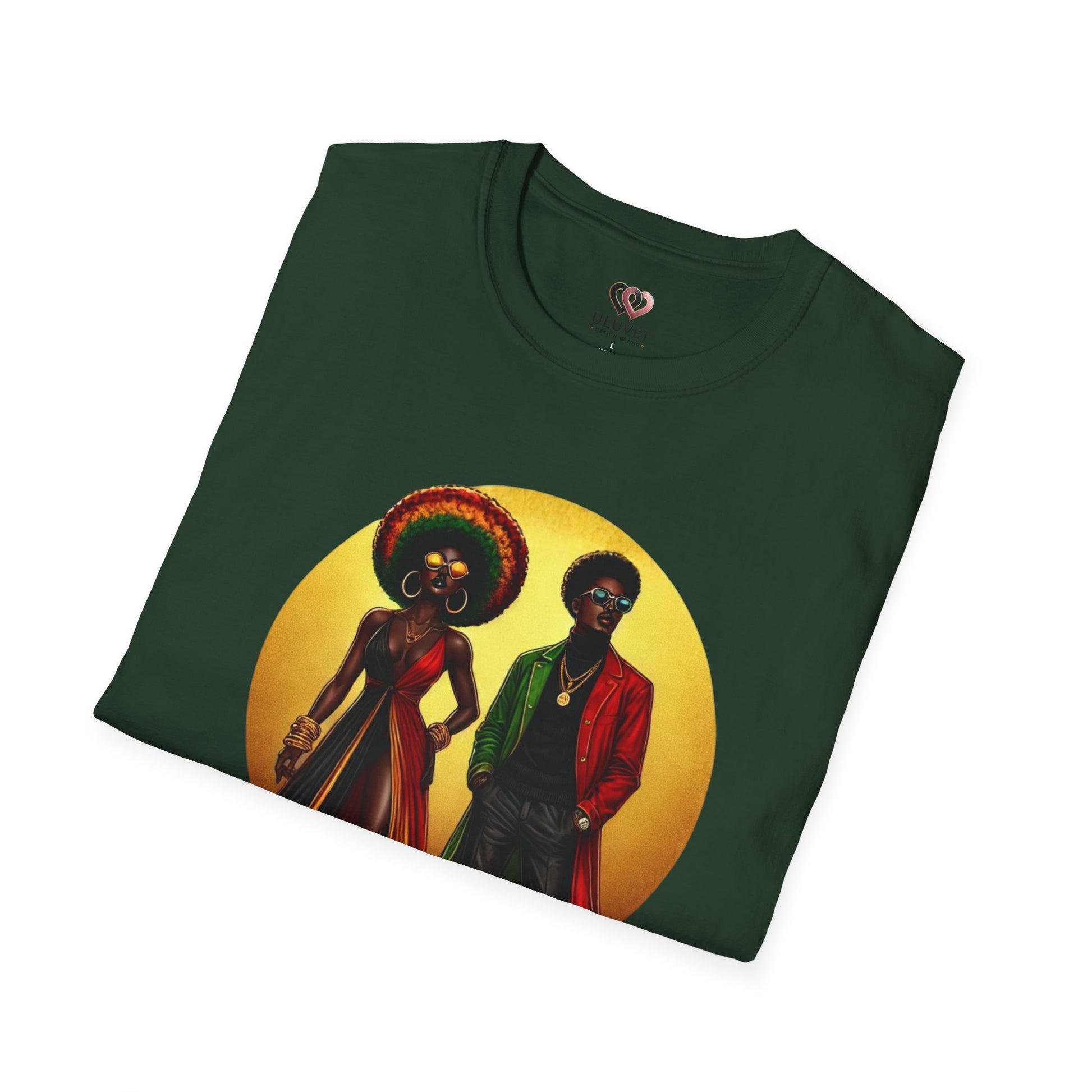 Step into a warm, soulful vibe with this lightweight crew tee featuring a bold, retro-inspired illustration of a confident couple bathed in golden light. The graphic blends 70s flair with modern color depth—deep olives, russets, and sunset gold—so the image pops on the soft white fabric. It drapes casually but cleanly, letting the art take center stage whether you layer it under a jacket or wear it solo. Wear it to community nights, record-store runs, or slow Sunday strolls—the shirt brings a feeling of cultural pride, vintage cool, and quiet confidence to everyday moments.