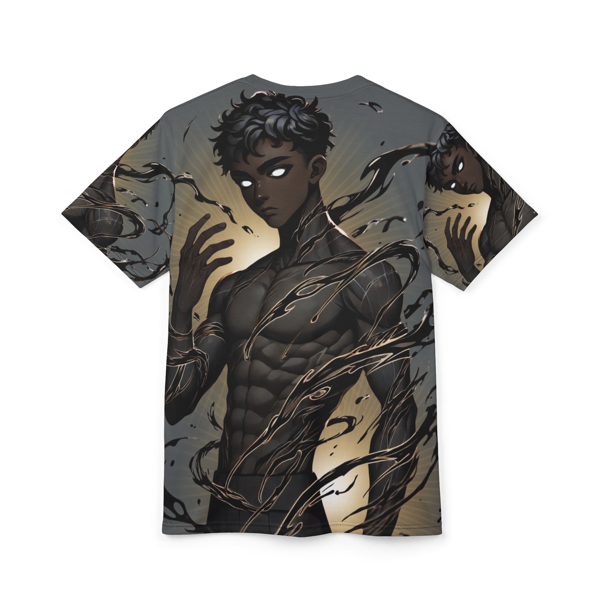An all-over print tee that feels like stepping into a midnight myth. The design centers on a shadow-forged protagonist — dark skin, luminous eyes, and sinewy, ink-like tendrils that coil and sweep across the fabric. The muted charcoal and bronze palette keeps the look moody and wearable, while the continuous print wraps the figure around the torso and sleeves for a dramatic, immersive effect. Lightweight and quick-drying polyester keeps the silhouette sharp and the details vivid, whether layered under a jacket for city nights or worn solo at a convention or meet-up. This tee fits true to size with a clean ribbed collar, reinforced shoulder tape, and side seams to maintain shape through wear. It’s for people who collect stories in visual form — fans of urban fantasy, dark anime aesthetics, and cosplay-adjacent streetwear who want their wardrobe to feel like a living panel from a graphic novel.